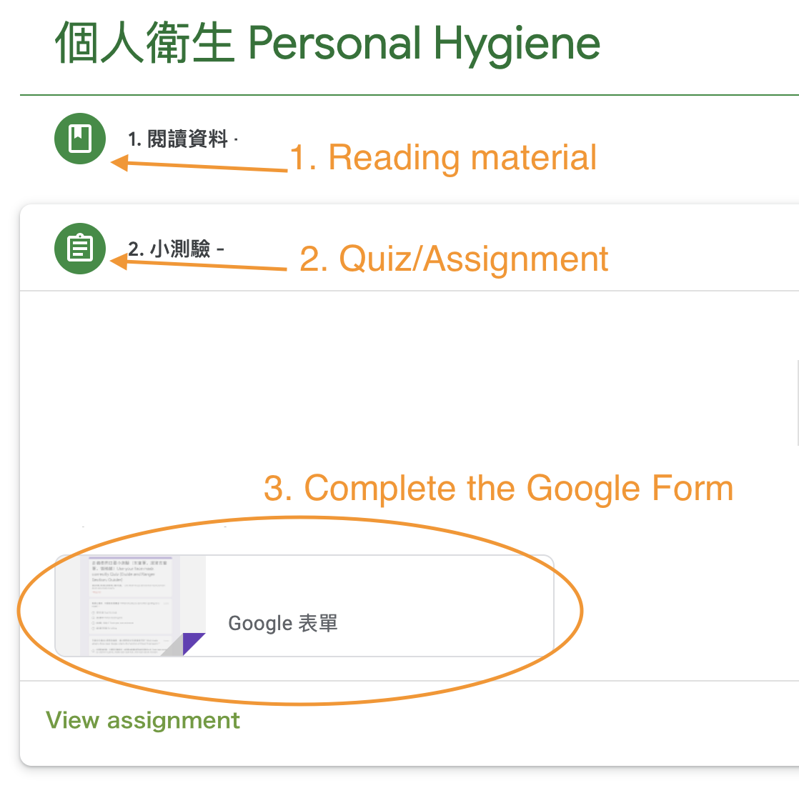 Step 5: If there are reading materials provided, please read the materials beforehand. Then, click [Quiz] and finish the google form attached.