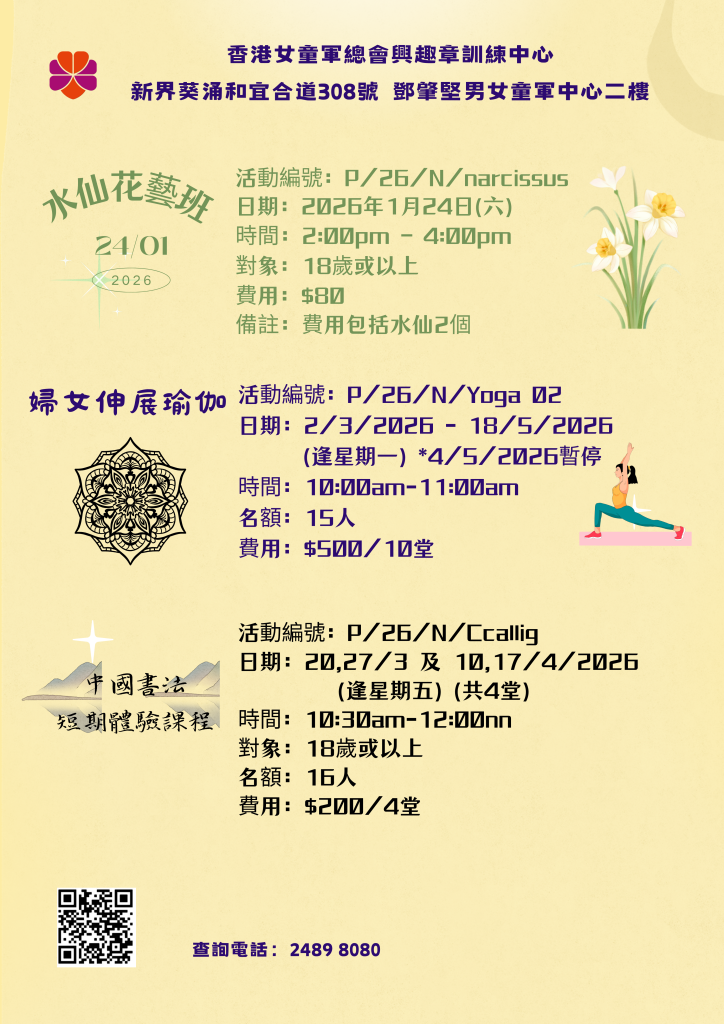 興趣章訓練中心活動-水仙花藝班、中國書法短期體驗課程、婦女伸展瑜伽,現正接受報名,詳情請按